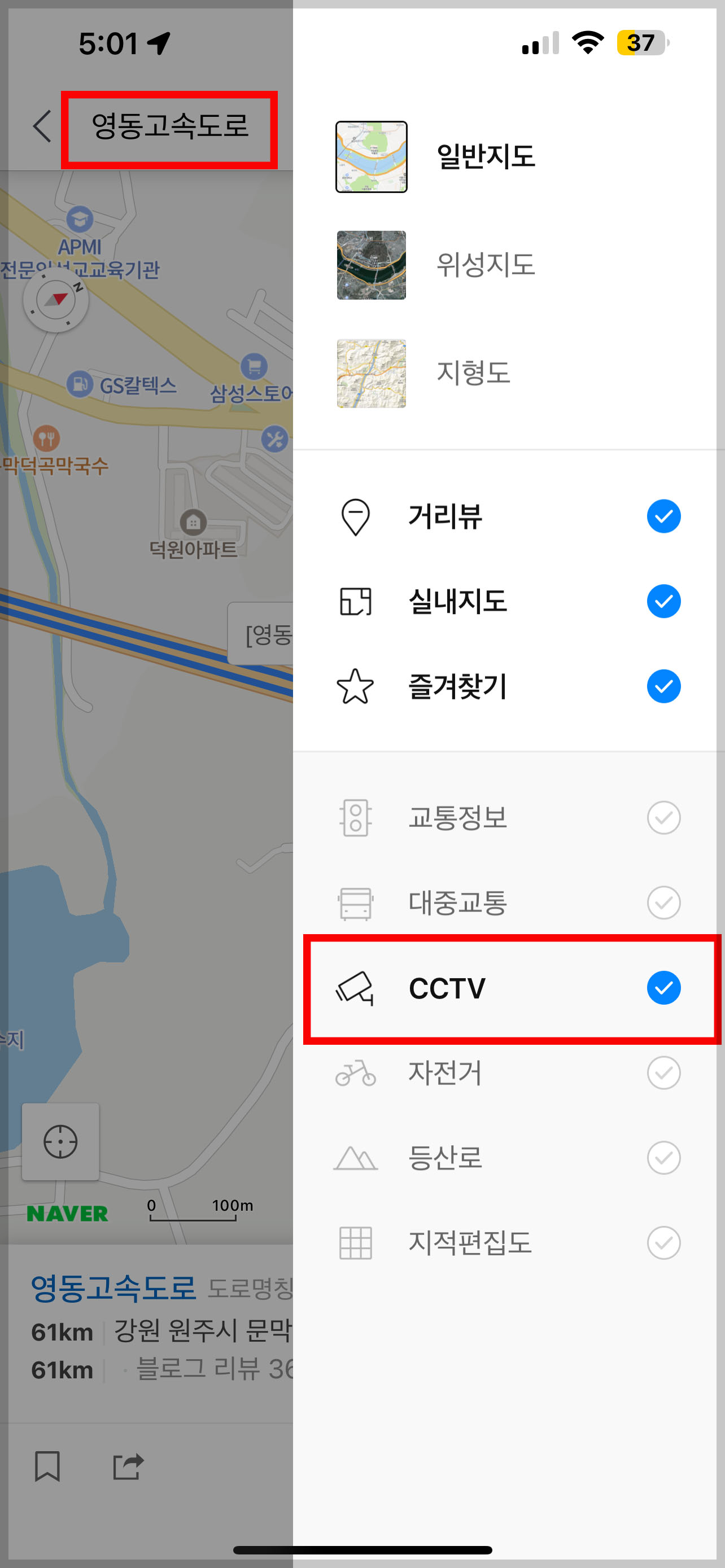 네이버 지도로도 아래와 같이 원하시는 구간의 CCTV 를 확인하실 수 있습니다.